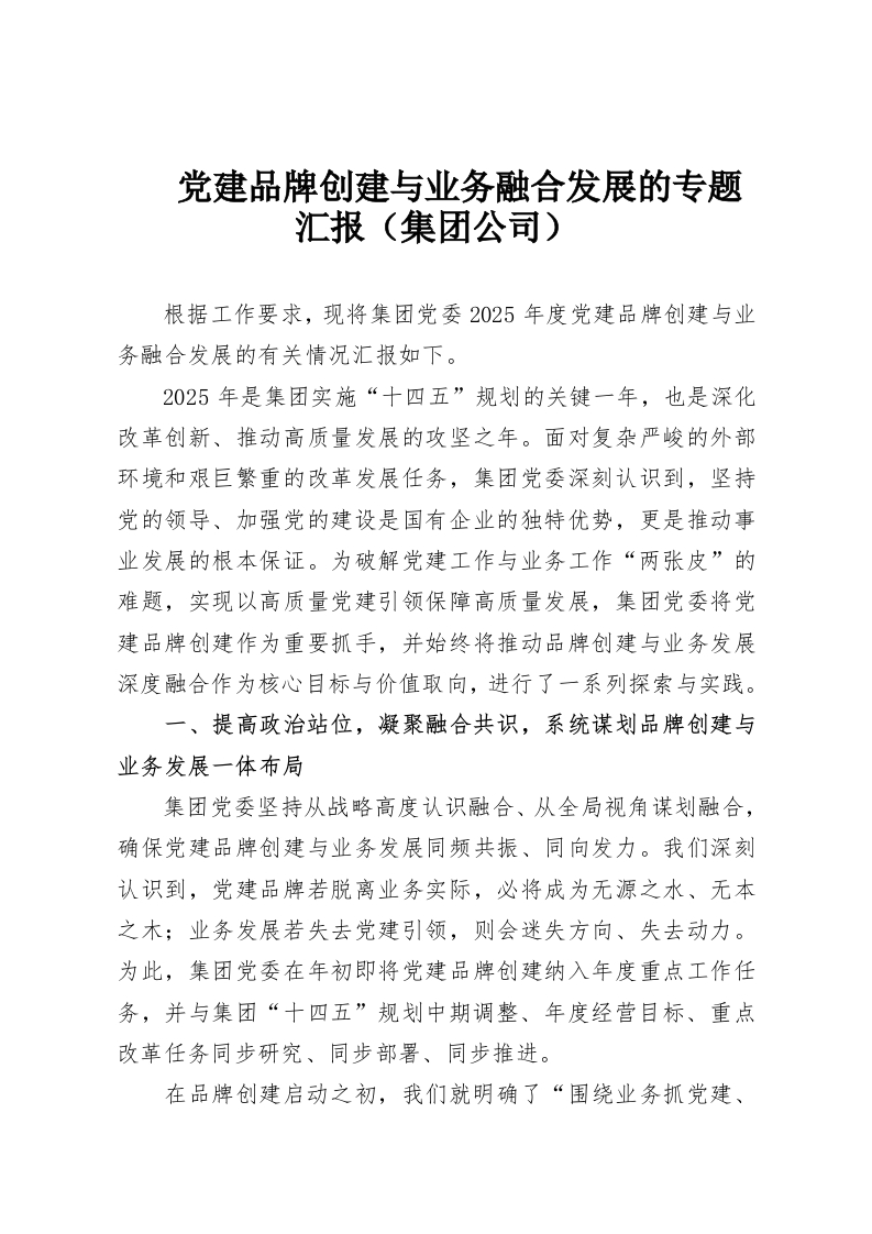 首页写作素材党建品牌创建与业务融合发展的专题汇报(集团公司)