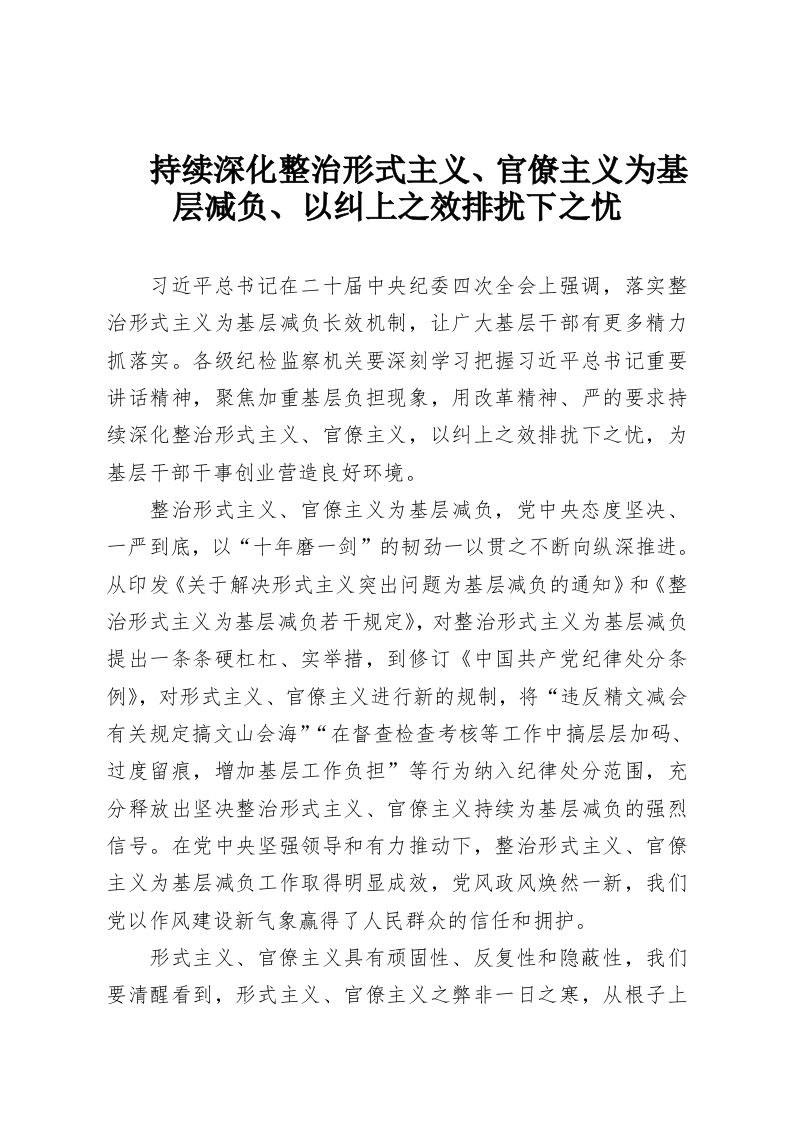 持续深化整治形式主义、官僚主义为基层减负、以纠上之效排扰下之忧