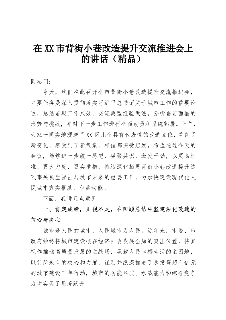 在XX市背街小巷改造提升交流推进会上的讲话(精品)