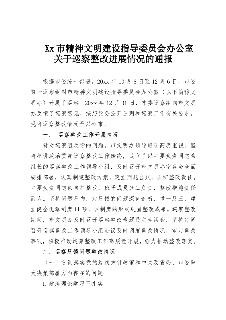Xx市精神文明建设指导委员会办公室关于巡察整改进展情况的通报