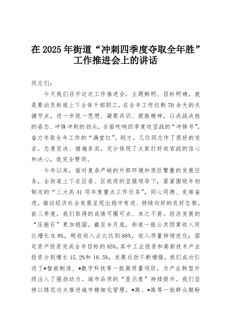 在2025年街道“冲刺四季度夺取全年胜”工作推进会上的讲话