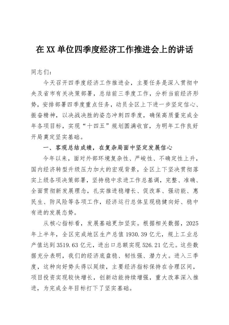 在XX单位四季度经济工作推进会上的讲话