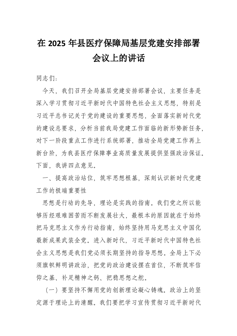 首页讲课讲稿在2025年县医疗保障局基层党建安排部署会议上的讲话
