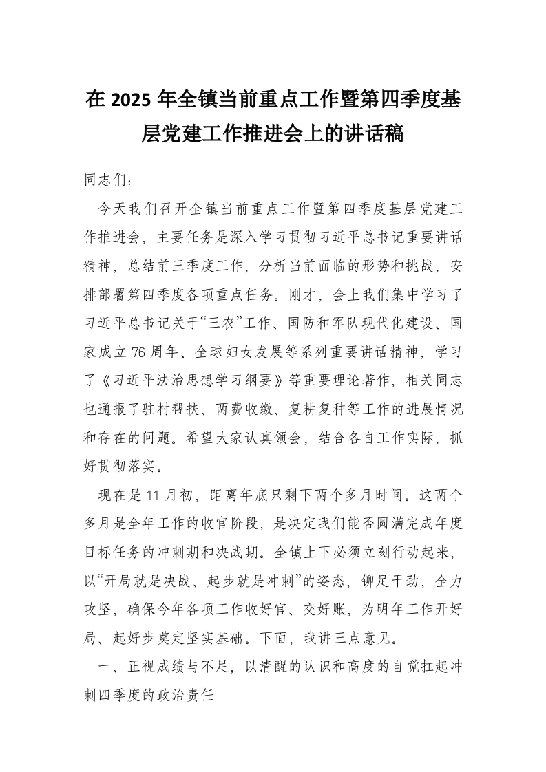 在2025年全镇当前重点工作暨第四季度基层党建工作推进会上的讲话稿