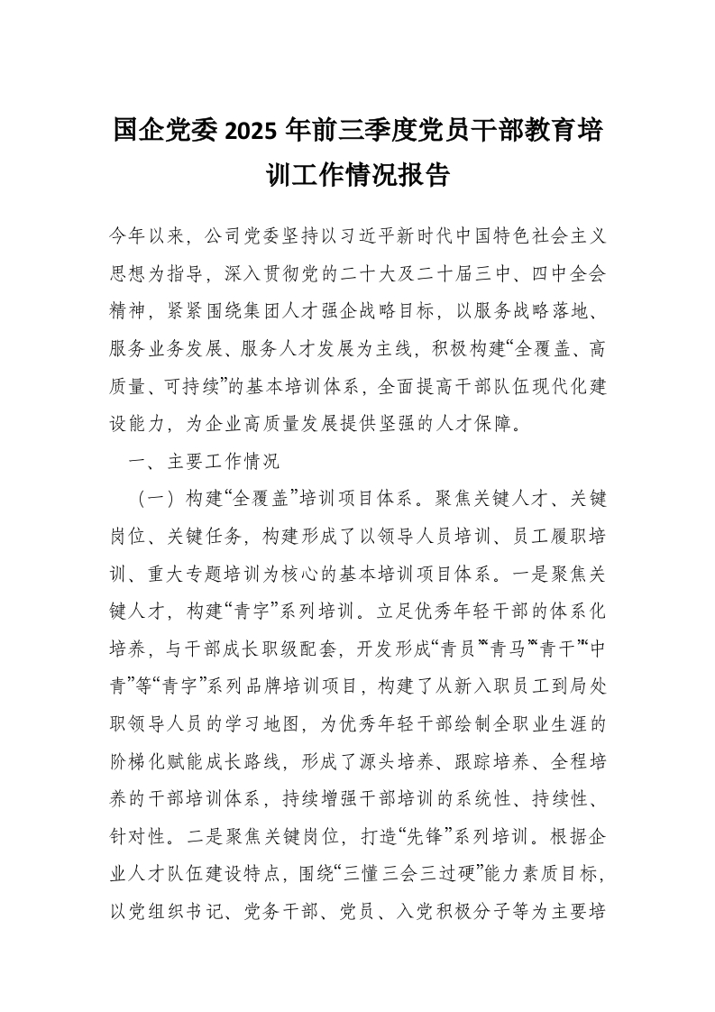 国企党委2025年前三季度党员干部教育培训工作情况报告