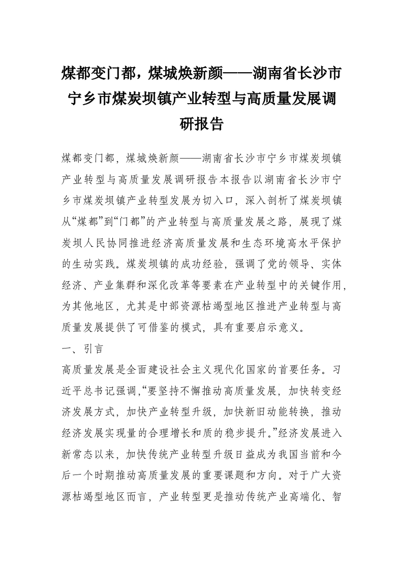 煤都变门都,煤城焕新颜——湖南省长沙市宁乡市煤炭坝镇产业转型与高质量发展调研报告