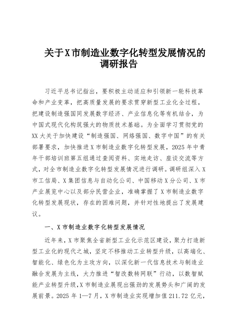 首页学习提升关于X市制造业数字化转型发展情况的调研报告