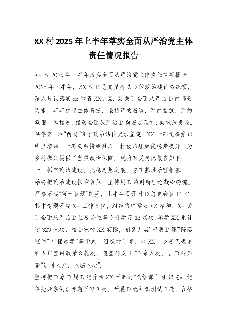 XX村2025年上半年落实全面从严治党主体责任情况报告