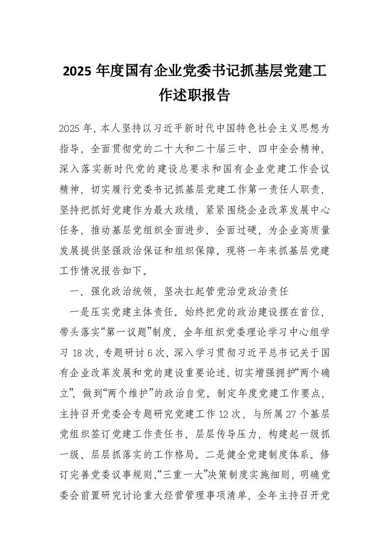 2025年度国有企业党委书记抓基层党建工作述职报告