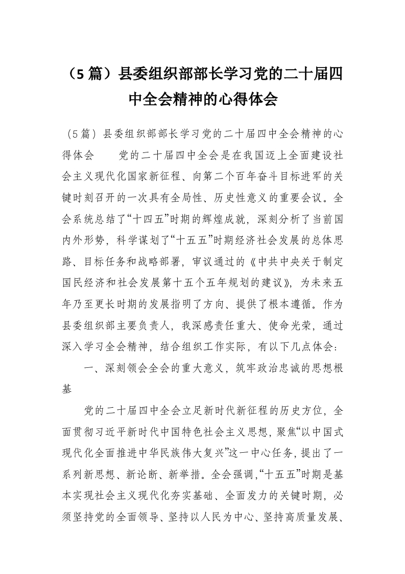 (5篇)县委组织部部长学习党的二十届四中***精神的心得体会