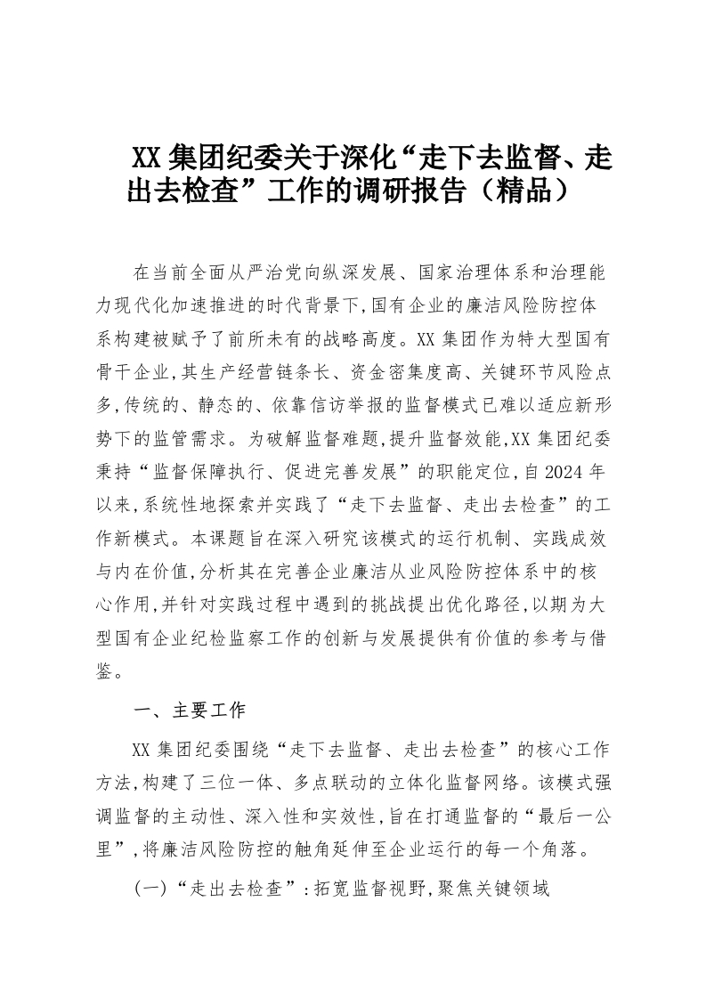 XX集团纪委关于深化“走下去监督、走出去检查”工作的调研报告(精品)