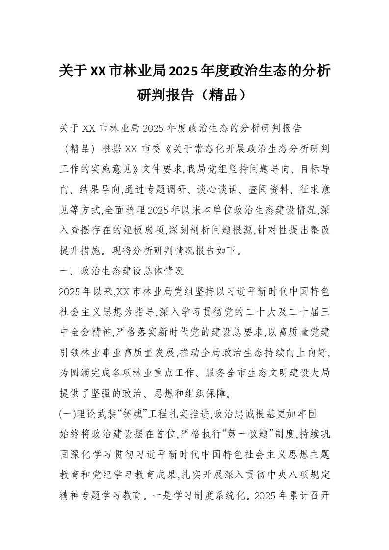 关于XX市林业局2025年度政治生态的分析研判报告(精品)