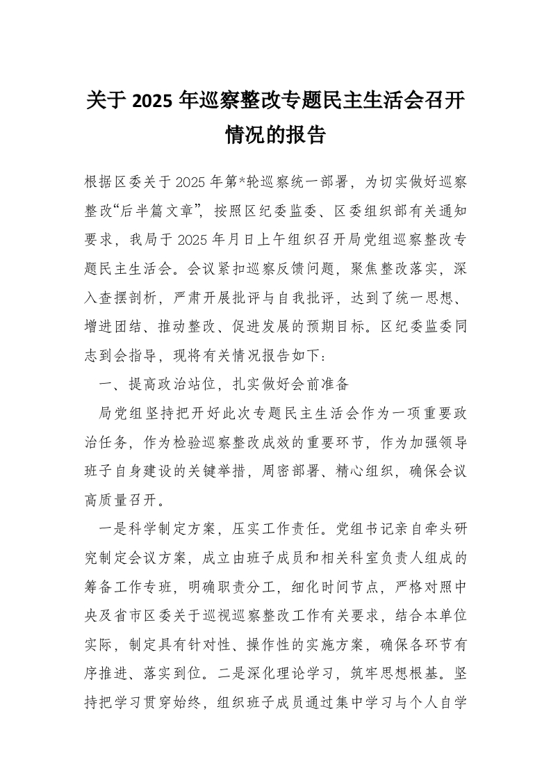 关于2025年巡察整改专题民主生活会召开情况的报告