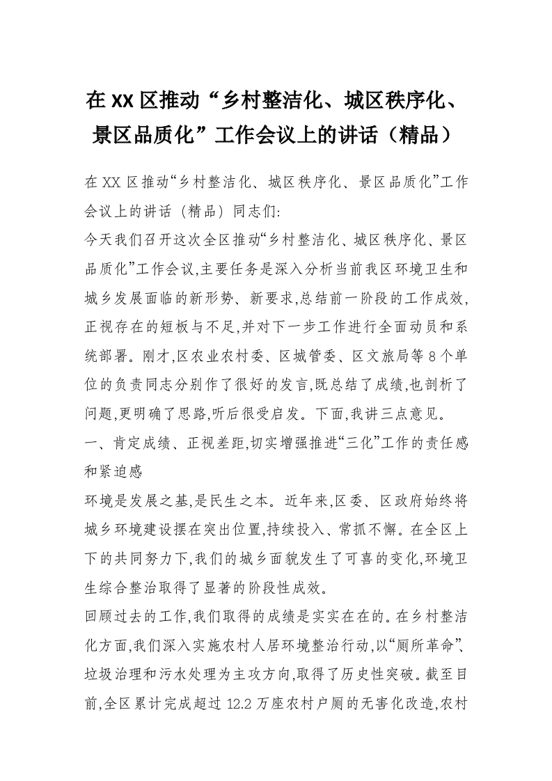 在XX区推动“乡村整洁化、城区秩序化、景区品质化”工作会议上的讲话(精品)