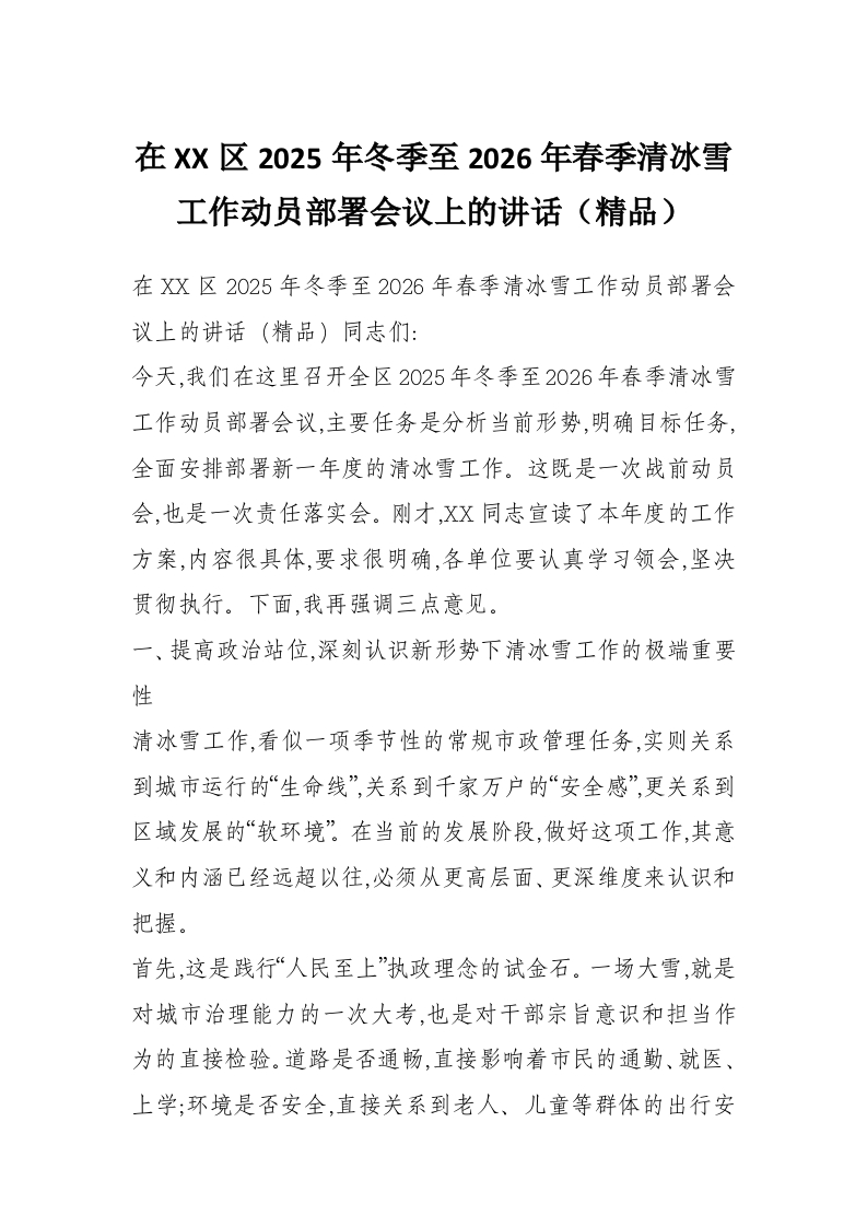 在XX区2025年冬季至2026年春季清冰雪工作动员部署会议上的讲话(精品)