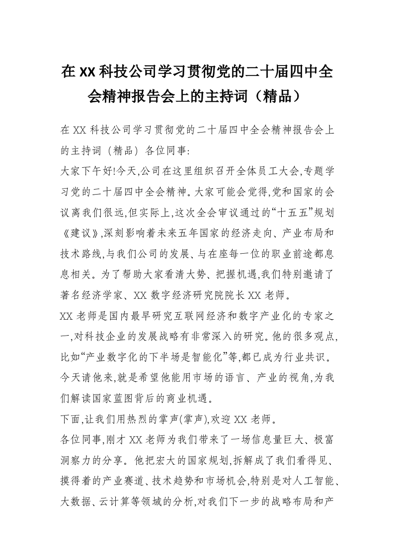 在XX科技公司学习贯彻党的二十届四中***精神报告会上的主持词(精品)