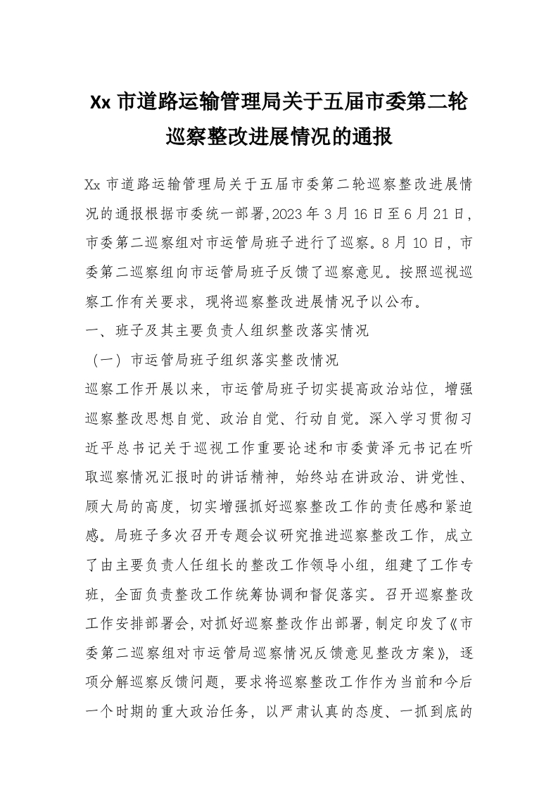 Xx市道路运输管理局关于五届市委第二轮巡察整改进展情况的通报