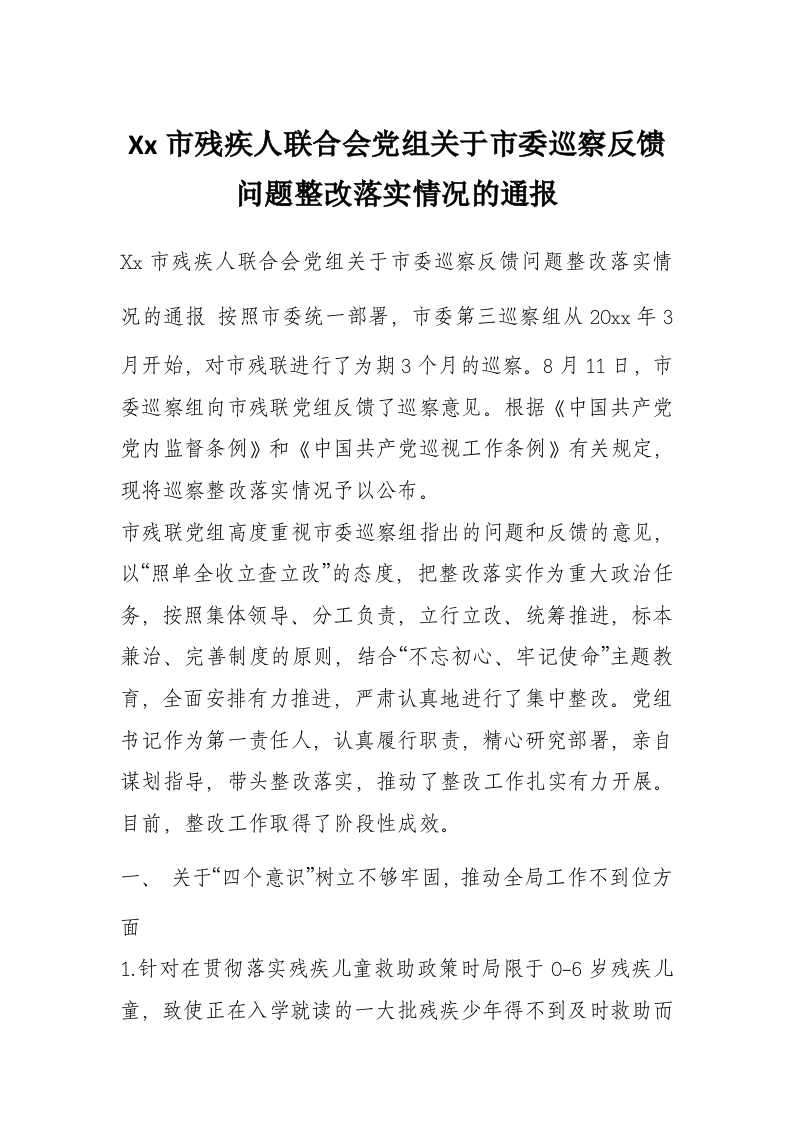 Xx市残疾人联合会党组关于市委巡察反馈问题整改落实情况的通报