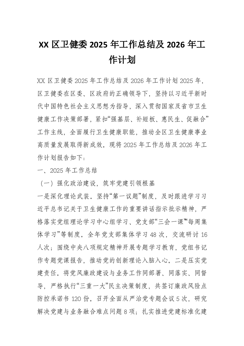 XX区卫健委2025年工作总结及2026年工作计划