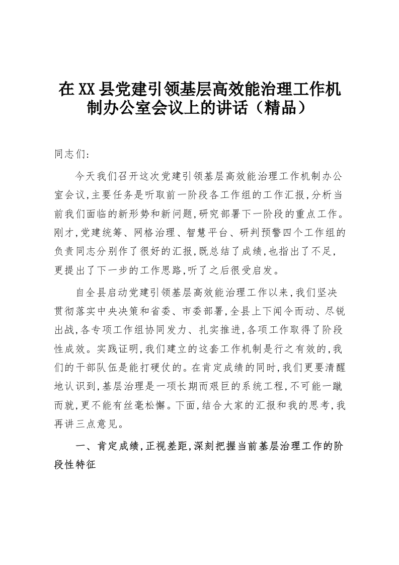 在XX县党建引领基层高效能治理工作机制办公室会议上的讲话(精品)
