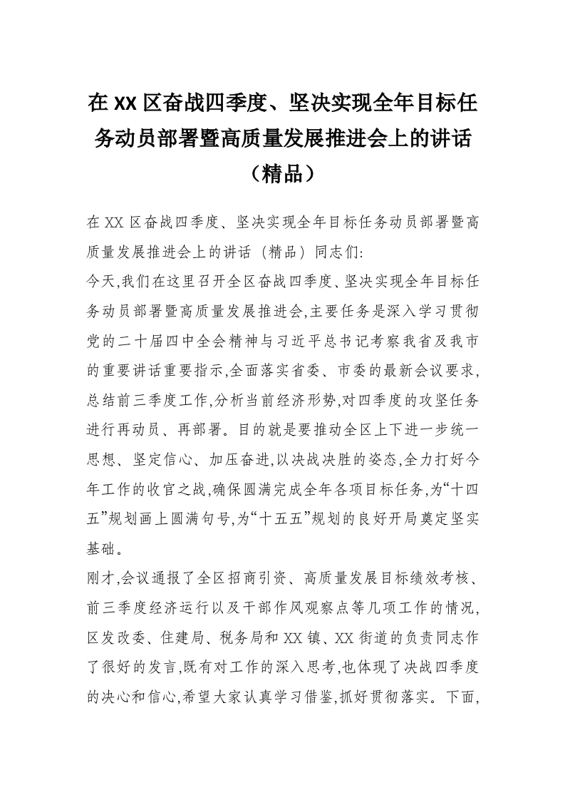 在XX区奋战四季度、坚决实现全年目标任务动员部署暨高质量发展推进会上的讲话(精品)