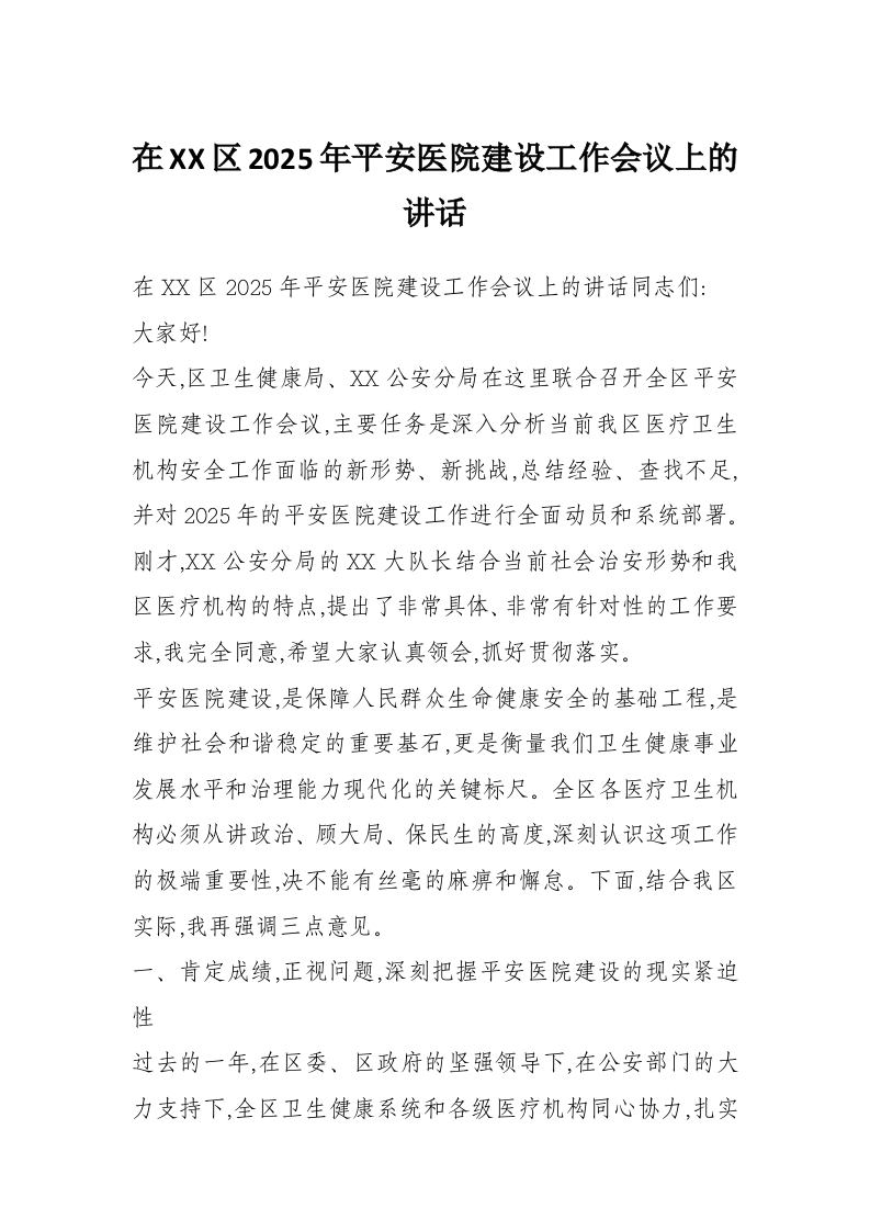 在XX区2025年平安医院建设工作会议上的讲话