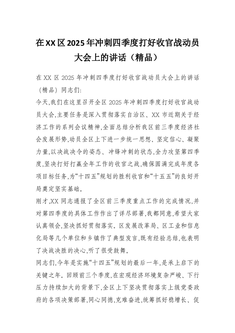 在XX区2025年冲刺四季度打好收官战动员大会上的讲话(精品)