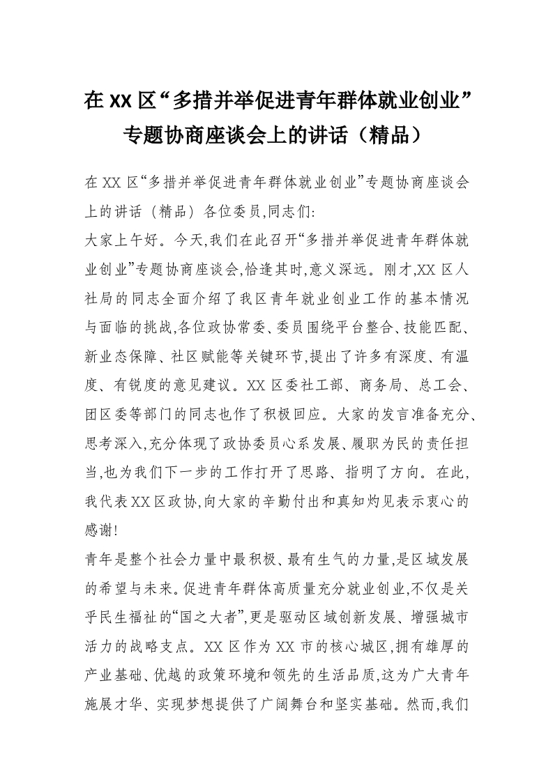 在XX区“多措并举促进青年群体就业创业”专题协商座谈会上的讲话(精品)