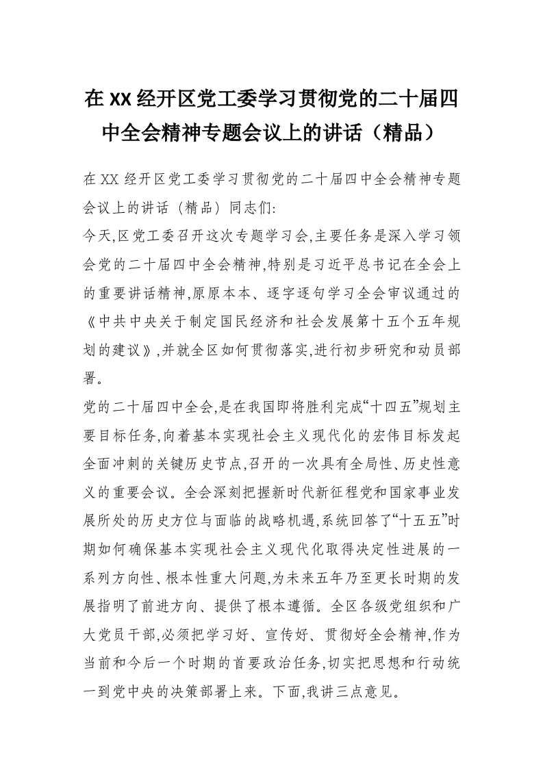 首页写作素材在XX经开区党工委学习贯彻党的二十届四中***精神专题会议上的讲话(精品)