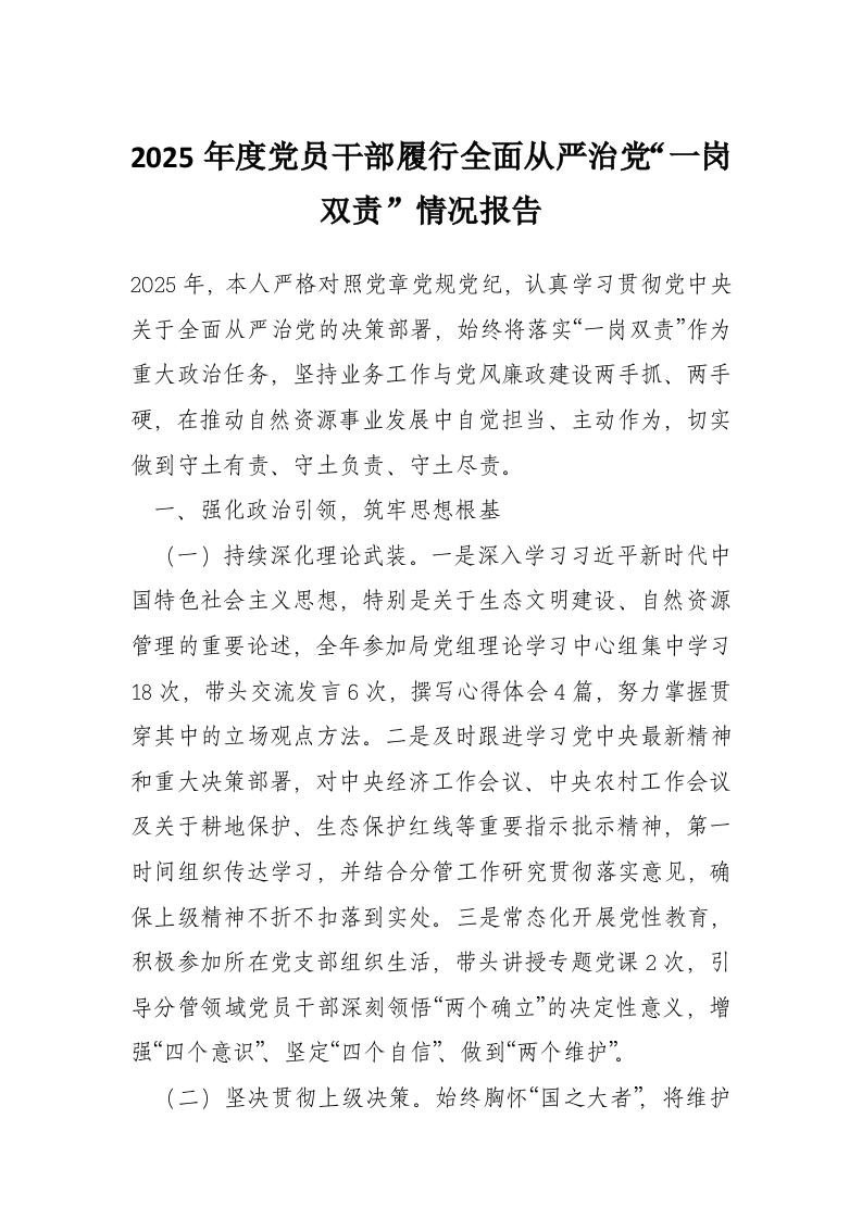 首页工作文档2025年度党员干部履行全面从严治党“一岗双责”情况报告