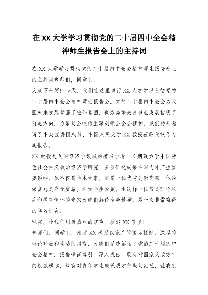 在XX大学学习贯彻党的二十届四中***精神师生报告会上的主持词