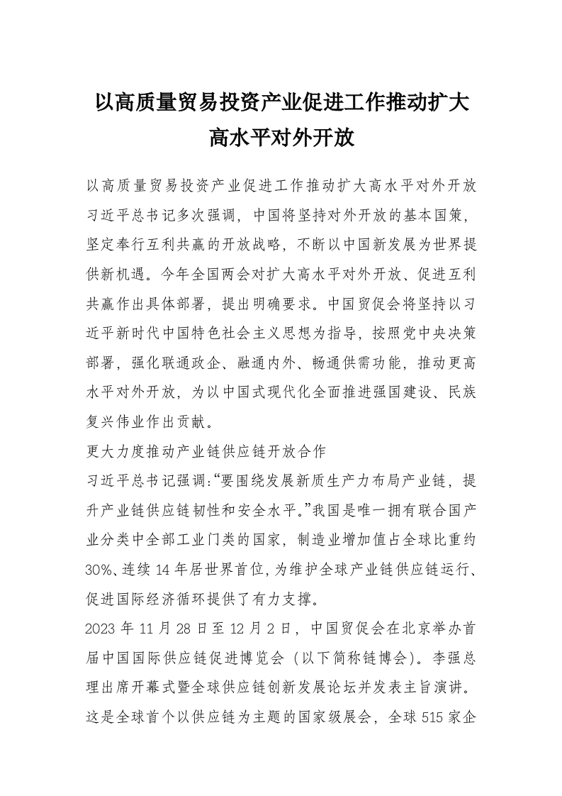 以高质量贸易投资产业促进工作推动扩大高水平对外开放