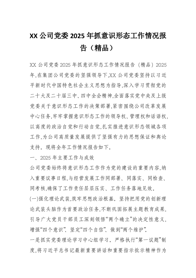 XX公司党委2025年抓意识形态工作情况报告(精品)