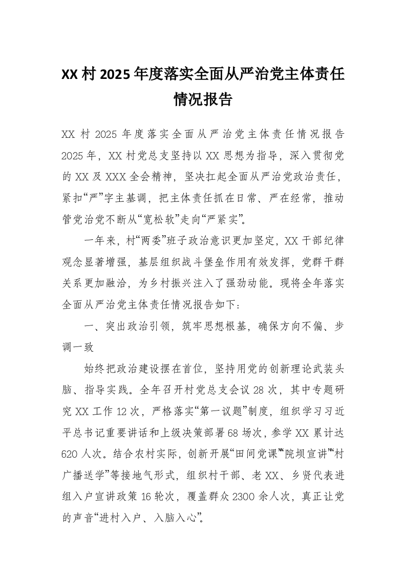 首页写作素材XX村2025年度落实全面从严治党主体责任情况报告