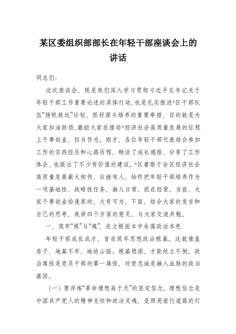 某区委组织部部长在年轻干部座谈会上的讲话
