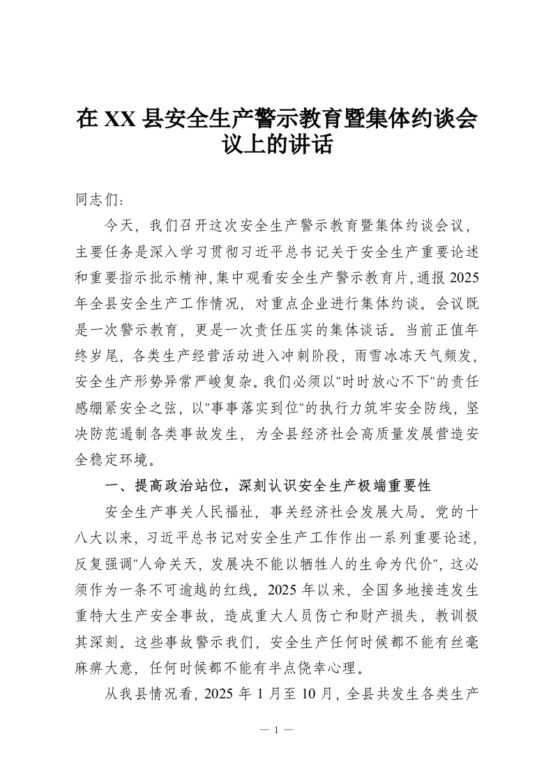 在XX县安全生产警示教育暨集体约谈会议上的讲话