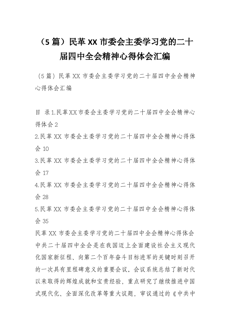 (5篇)民革XX市委会主委学习党的二十届四中***精神心得体会汇编