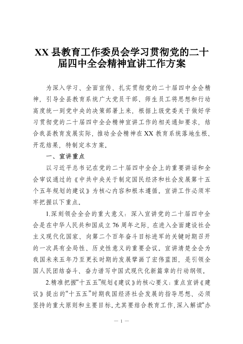 XX县教育工作委员会学习贯彻党的二十届四中***精神宣讲工作方案