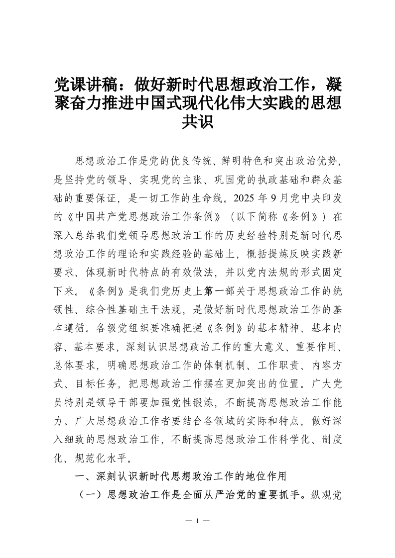 党课讲稿:做好新时代思想政治工作,凝聚奋力推进中国式现代化伟大实践的思想共识