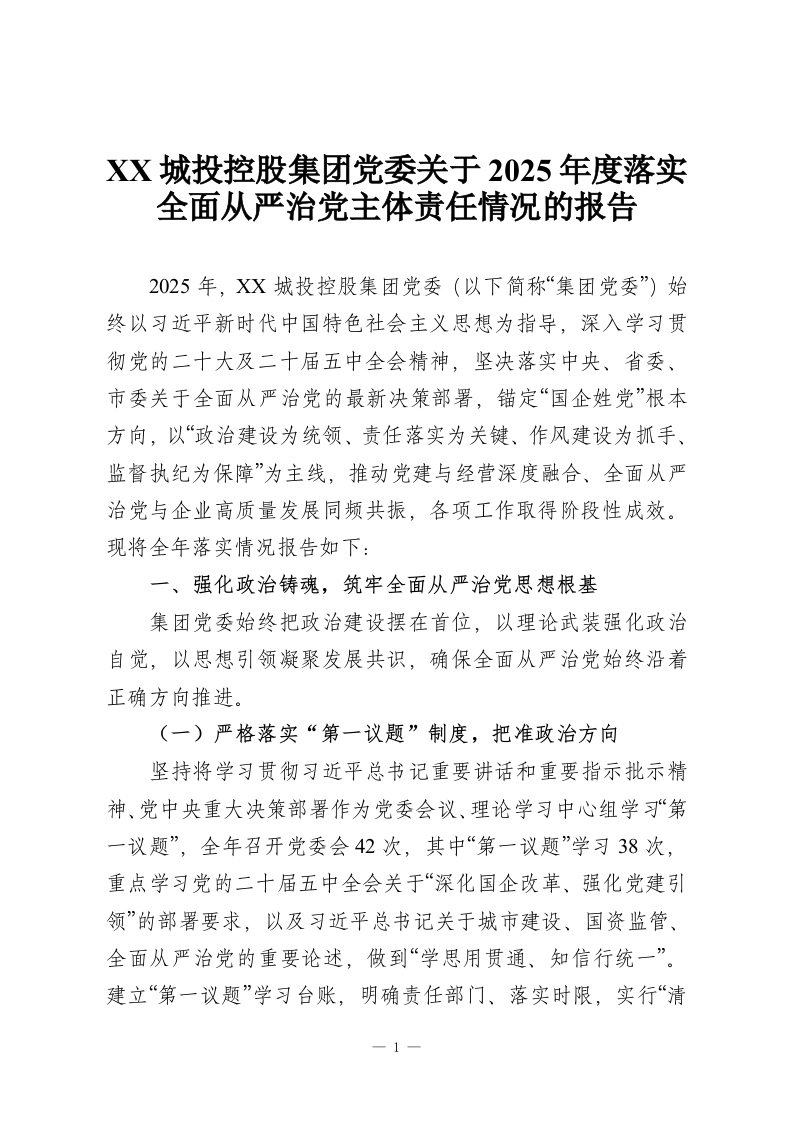 XX城投控股集团党委关于2025年度落实全面从严治党主体责任情况的报告