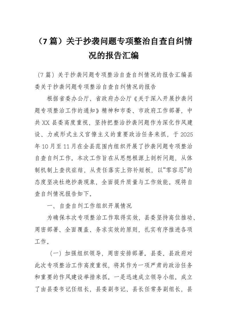 (7篇)关于公文抄袭问题专项整治自查自纠情况的报告汇编
