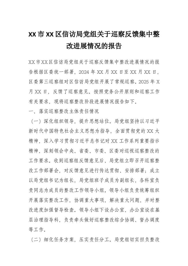 XX市XX区信访局党组关于巡察反馈集中整改进展情况的报告