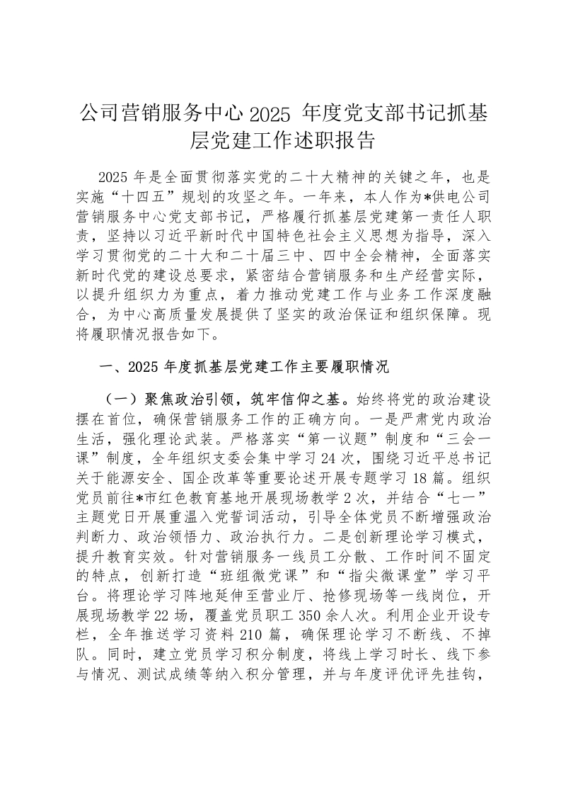 公司营销服务中心2025年度党支部书记抓基层党建工作述职报告
