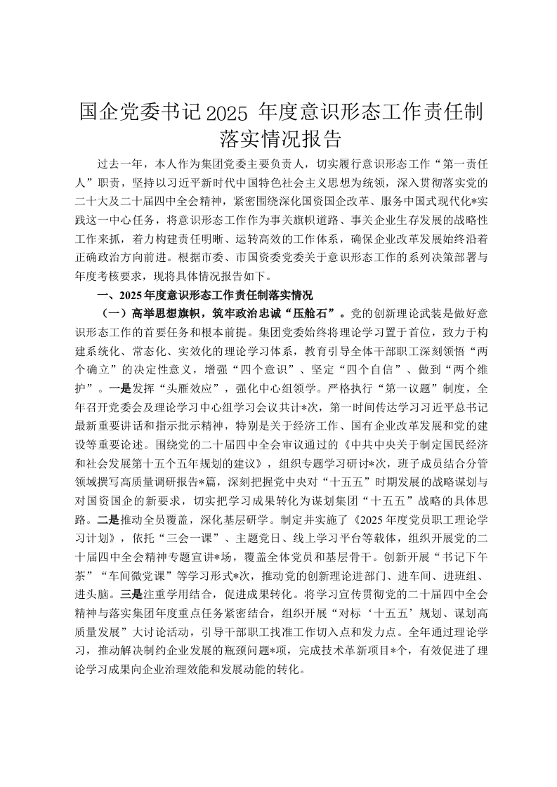 国企党委书记2025年度意识形态工作责任制落实情况报告