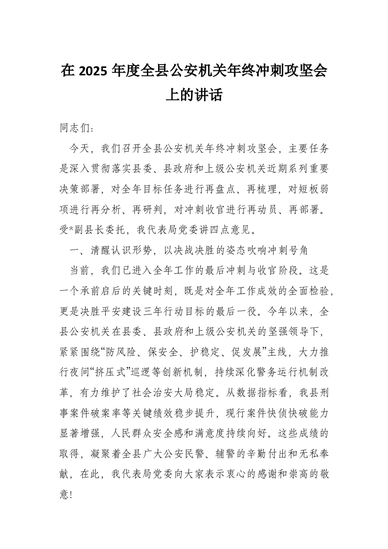 在2025年度全县公安机关年终冲刺攻坚会上的讲话