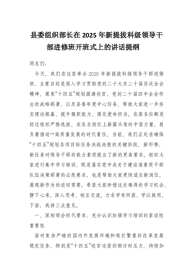 首页精选范文县委组织部长在2025年新提拔科级领导干部进修班开班式上的讲话提纲​