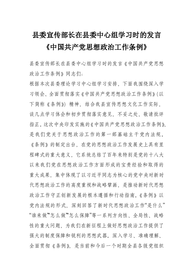 县委宣传部长在县委中心组学习时的发言《中国***思想政治工作条例》