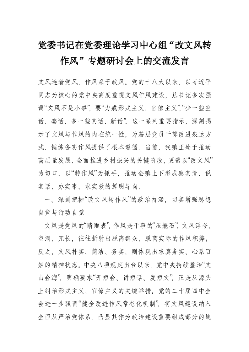 党委书记在党委理论学习中心组“改文风转作风”专题研讨会上的交流发言