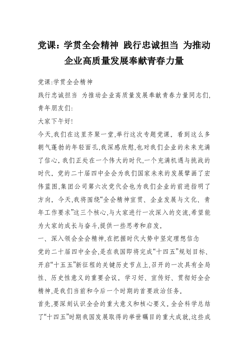 党课:学贯***精神 践行忠诚担当 为推动企业高质量发展奉献青春力量