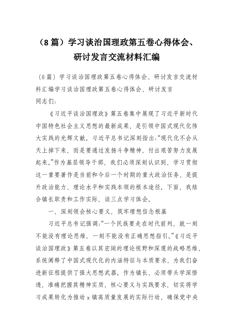 (8篇)学习谈治国理政第五卷心得体会、研讨发言交流材料汇编